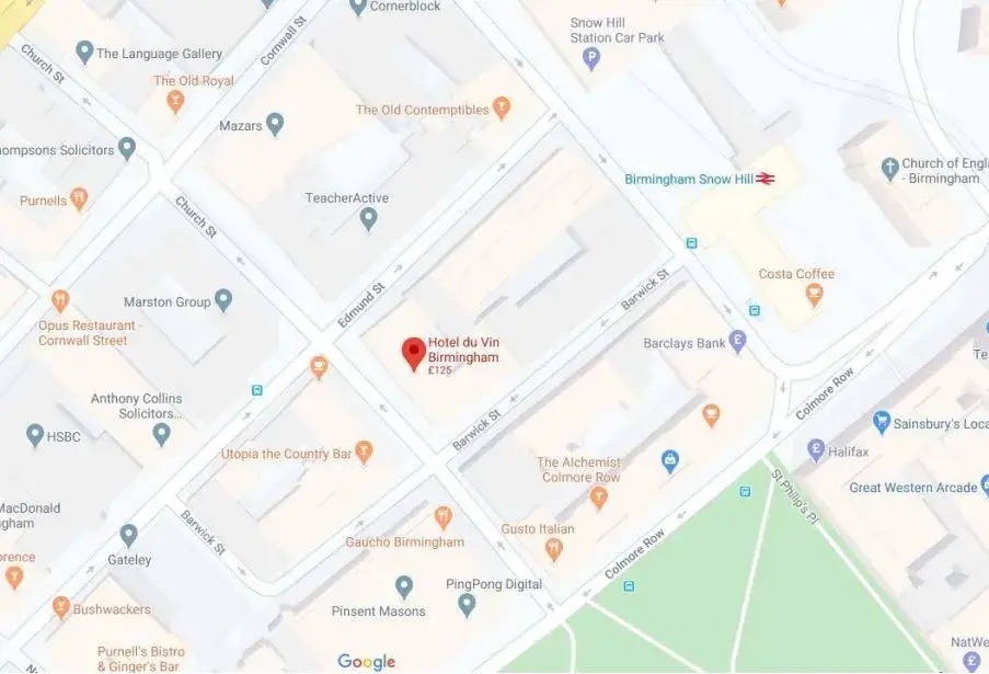 From Birmingham New Street Station, walk west then turn right towards Stephenson St. Turn left onto Stephenson St, then right onto Lower Temple St and continue onto Temple St. Finally, turn left onto Church St and the hotel will be on the right.